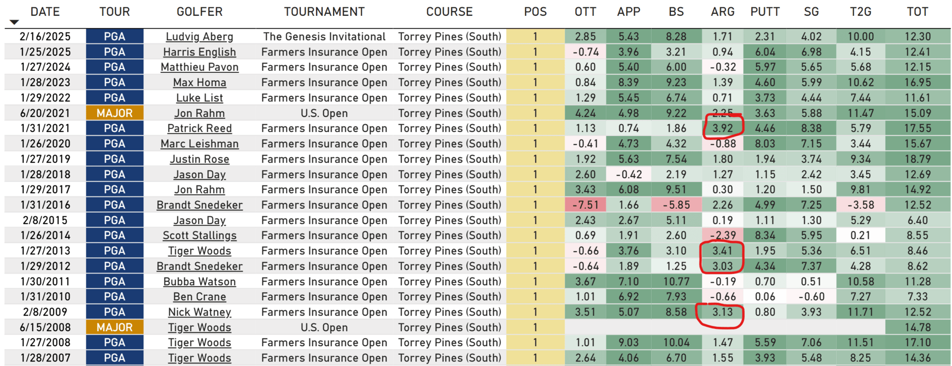 This isn't just "he plays well here." This is a career within a career. He’s got a total of 56 starts in California and he’s gaining +1.15 strokes per round. And if you isolate it to just the Farmers, American Express, and Pebble Beach — it gets even better. The results are ridiculous plus he’s got the apex height and short-game to add another notch to that resume this week.