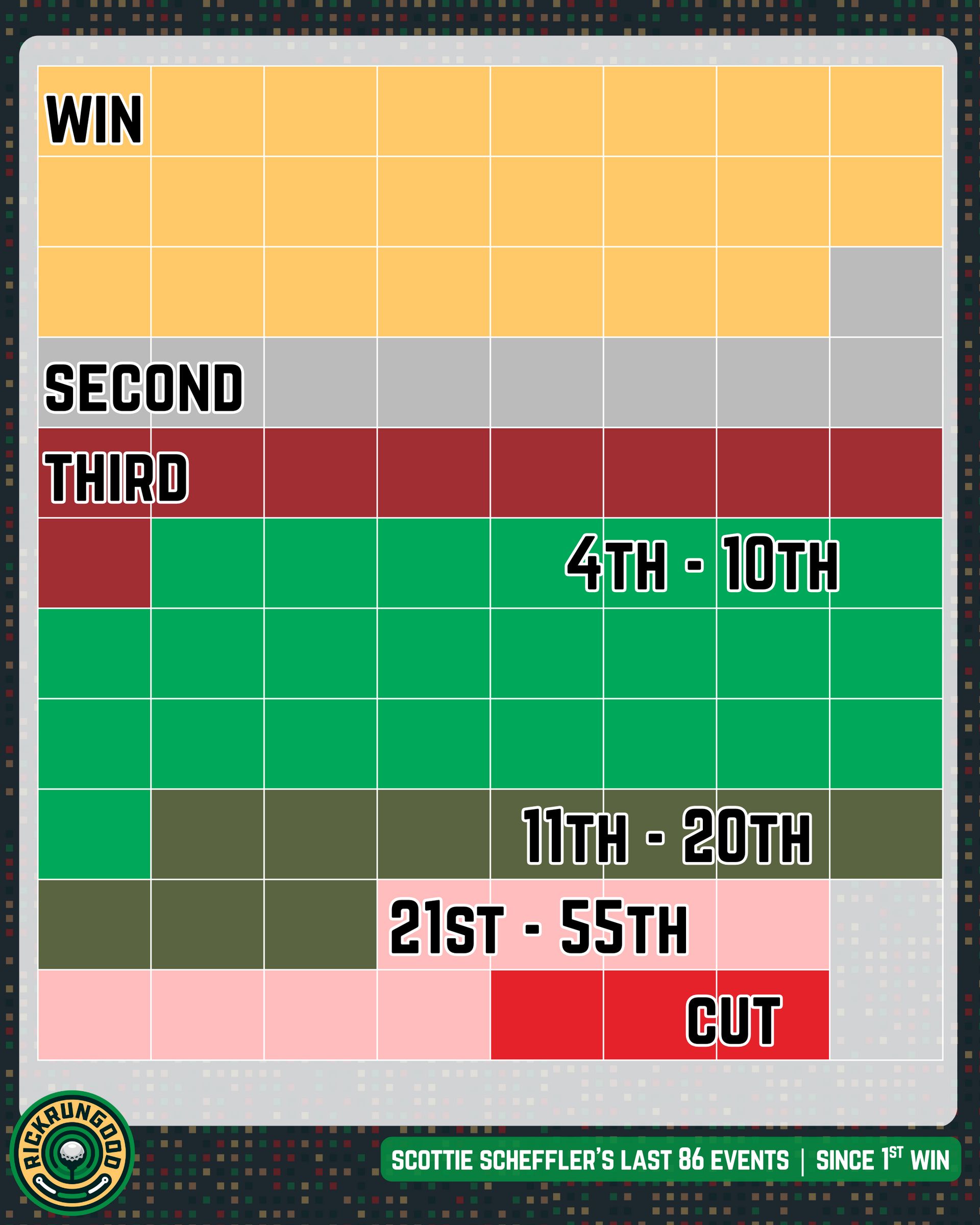 While his historic winning rates are getting absurd, his consistency stands out to me the most. Since the 2022 Phoenix Open, his first win, Scheffler has played in 86 different events. He’s finished inside the Top 20 in 87.2% of those events. It’s one thing to read the numbers but here it is visualized: